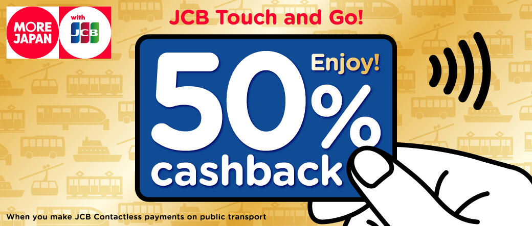 Jika Anda menggunakan transportasi umum di Jepang yang memenuhi syarat untuk promo ini dan membayar tarifnya melalui pembayaran nirsentuh kartu JCB, Anda akan menerima 50% dari jumlah yang Anda bayar sebagai cashback di kemudian hari.