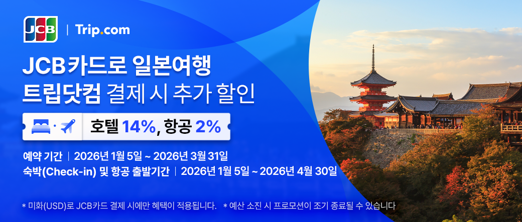 1.Trip.com 에서 일본의 호텔을 예약하시고 JCB 카드로 결제하시면 14% 할인 혜택을 받으실 수 있습니다!