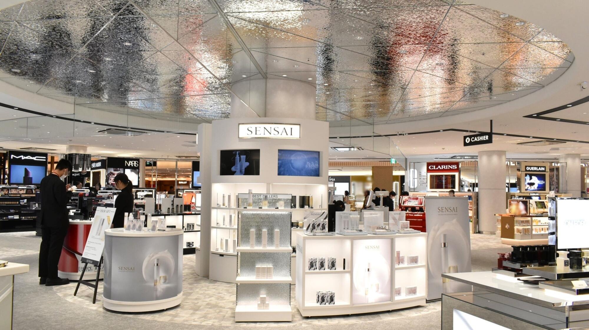 통로 오른쪽에 펼쳐진 '화장품' 구역에는 해외 명품 브랜드는 물론 일본 브랜드도 다양하게 준비되어 있습니다. 일본에서 인기 있는 'SHISEIDO', 'DECORTÉ'를 비롯해 'BAUM', 'NARS', 'SENSAI' 등 화려한 화장품 병이 쇼케이스에 진열되어 있어요. 스테디셀러부터 떠오르는 라이프스타일 화장품까지 다양한 장르의 화장품과 향수가 눈길을 사로잡고 있습니다.
