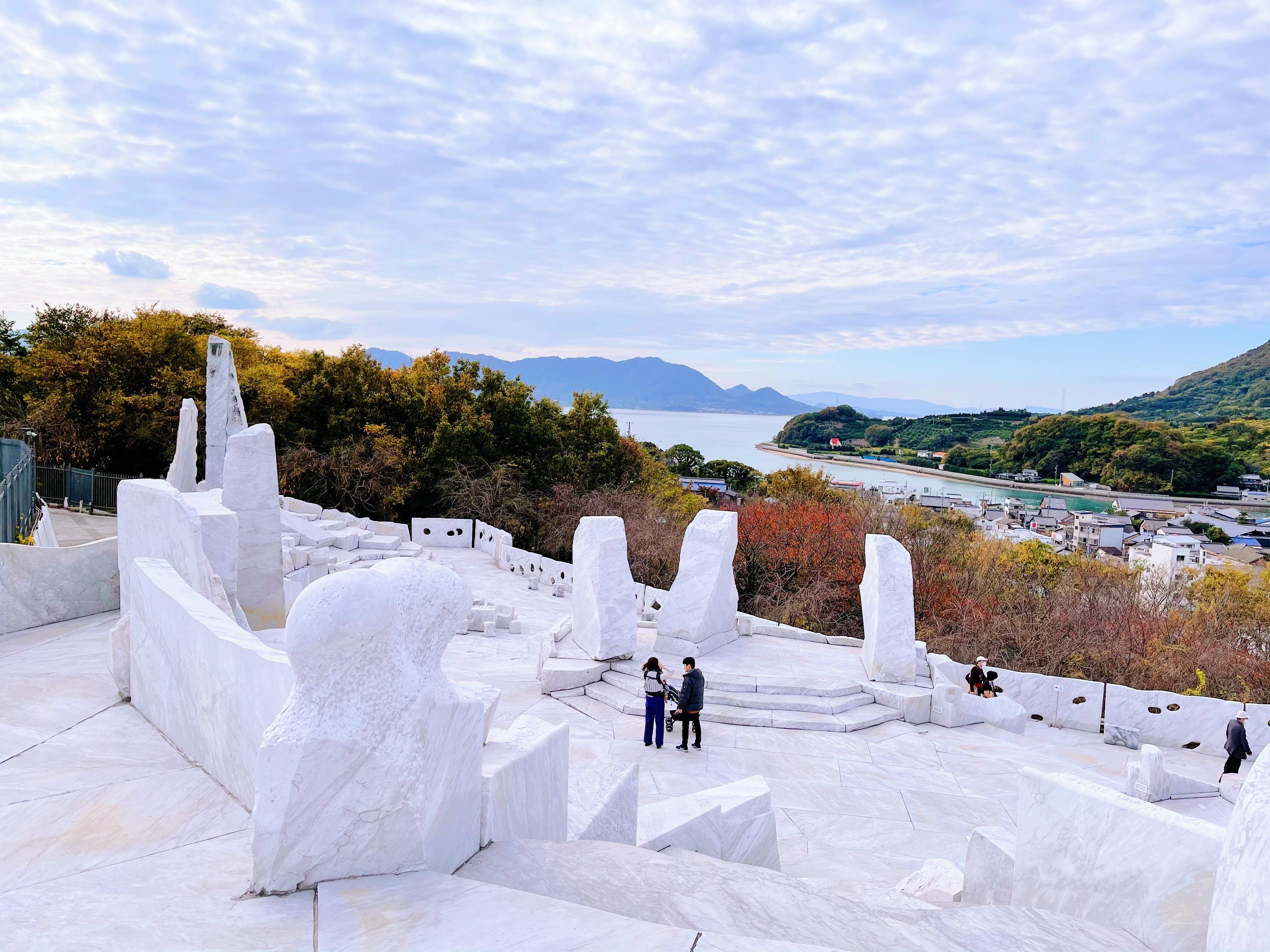 안쪽으로 가면 갈수록 다른 세상을 느낄 수 있습니다. 형형색색의 비주얼이 확확 변하고, 눈부실 정도로 새하얀 기념물이 눈앞에 나타납니다. ’미래 마음의 언덕’이라고 불리고 있는 공중 정원은 히로시마 출신의 조각가, 구에타니 잇토 씨가 제작했습니다. 이탈리아에서 채굴된 3000t의 대리석을 사용하여 완성되기까지 약 16년. 푸른 하늘과 바다의 콜라보레이션은 마치 에게해에 간 듯, 일본에서 세계를 느낄 수 있습니다.