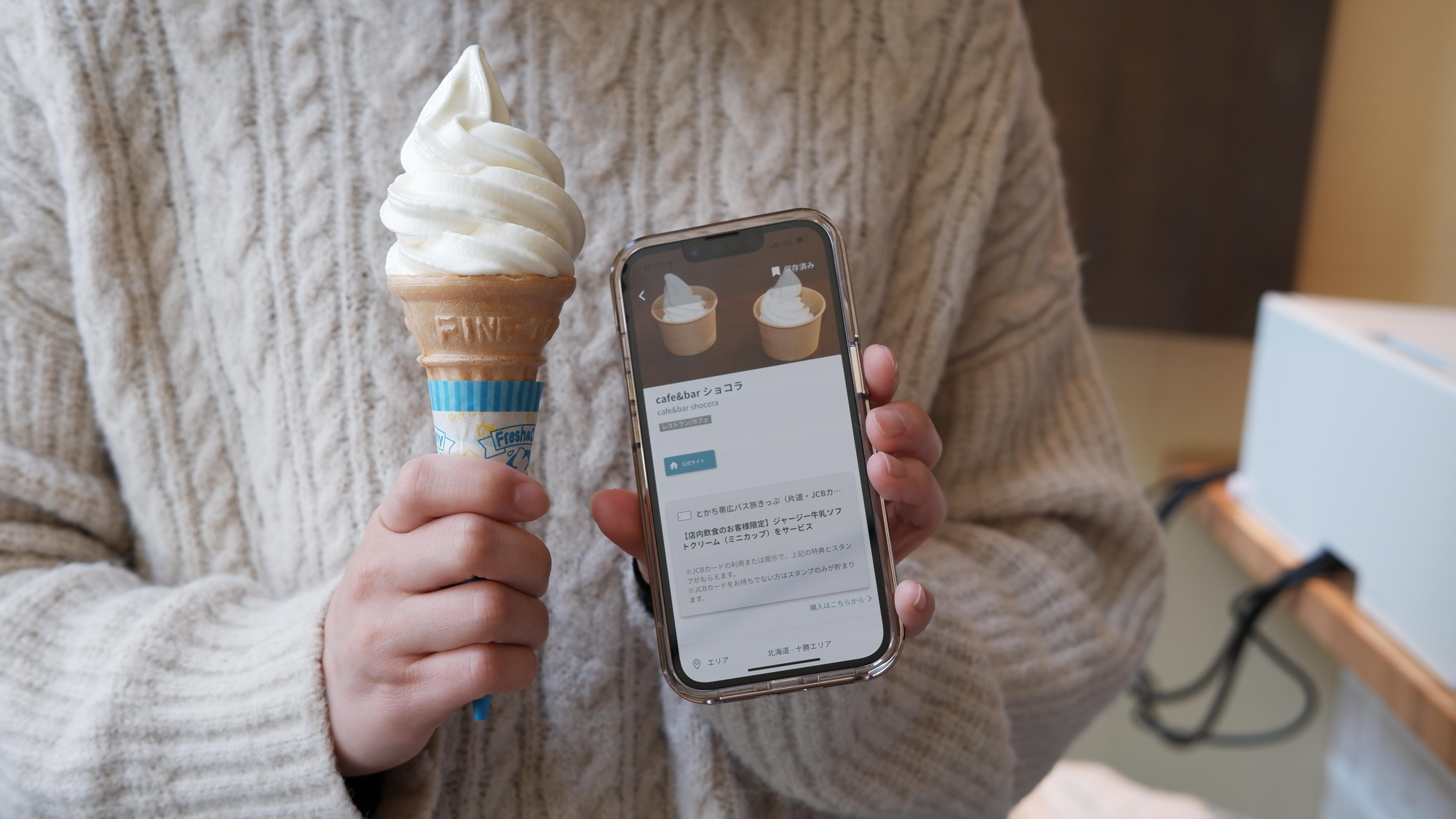 이번에는 신치토세 공항에서 고속버스 '도카치 밀키 라이너'로 이동합니다. Horai 앱을 다운로드하는 것만으로 저렴한 티켓을 예약할 수 있습니다. 또한 JCB 카드를 갖고 계신 분은 앱을 사용하여 레스토랑 등에서 할인을 받을 수 있습니다.
