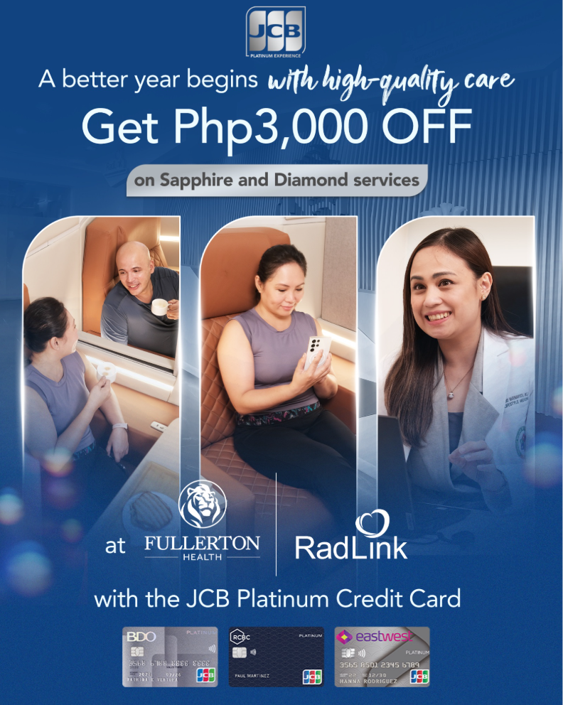 - JCB Platinum Credit Cardholders may enjoy PHP3,000 OFF on Sapphire and Diamond Services from January 15 to July 15, 2026.