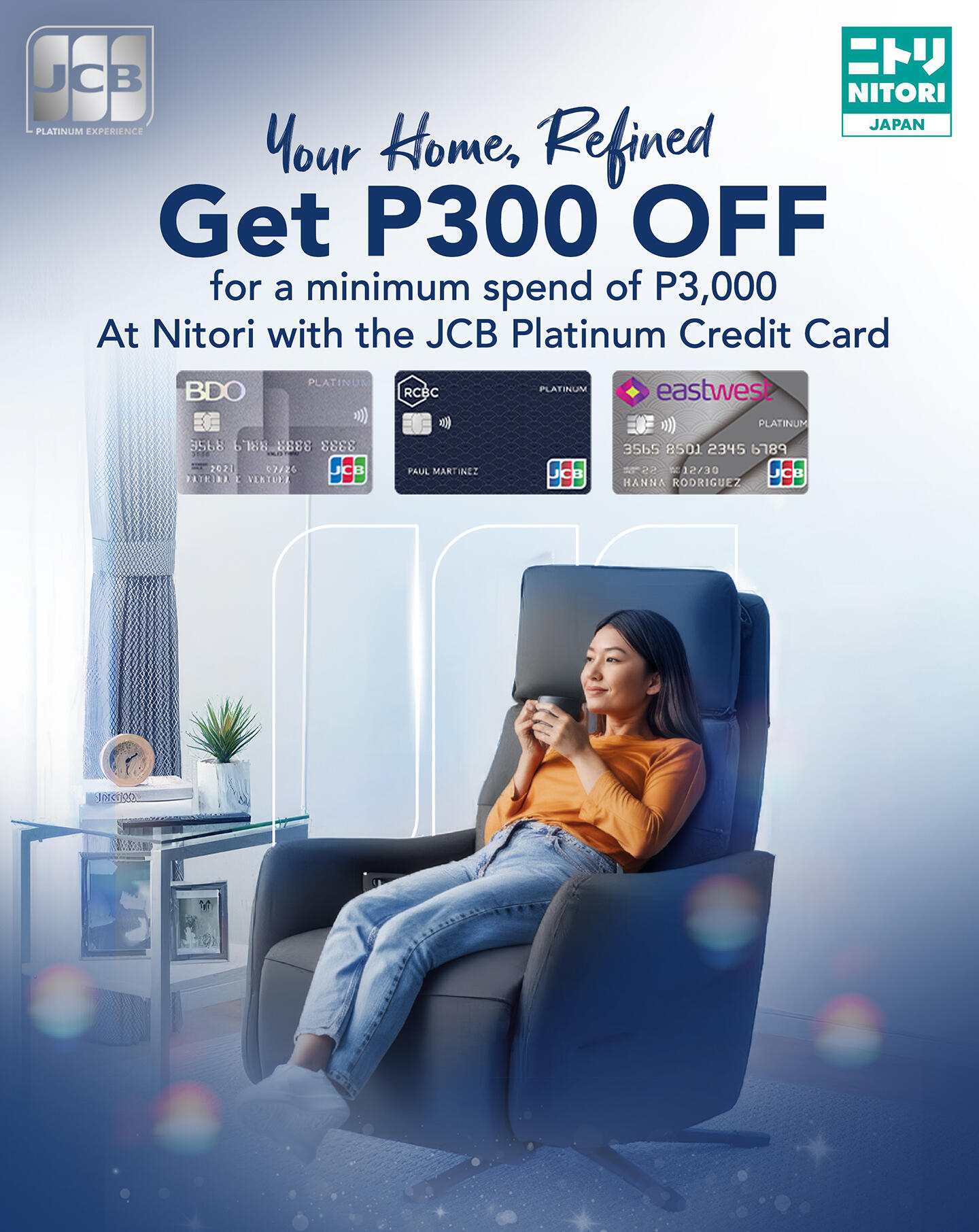 - JCB Platinum Credit Cardholders may enjoy P300 OFF for a min. spend of P3,000 from January 15 to July 15, 2026 at all Nitori branches