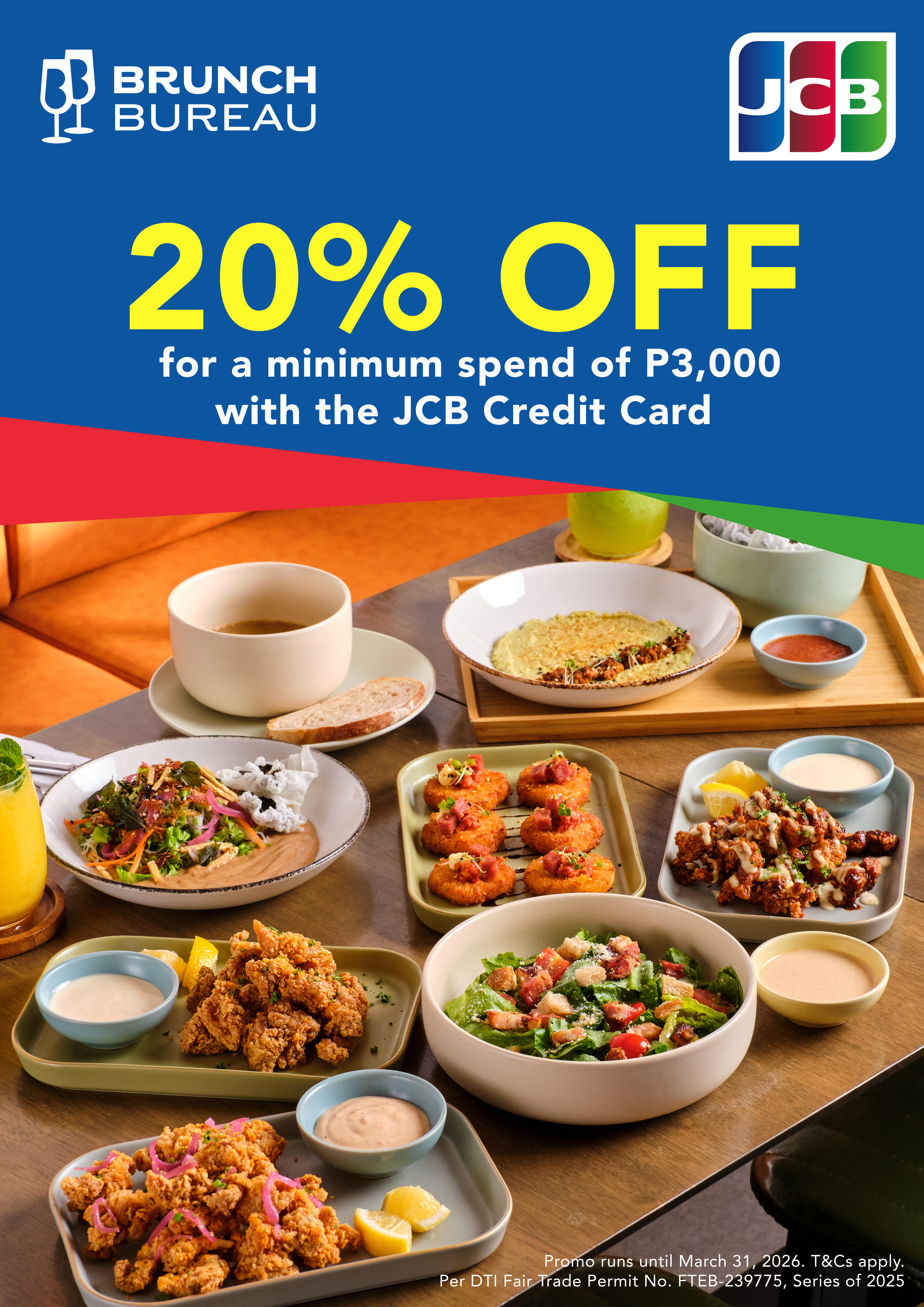- JCB Credit Cardholders may enjoy 20% discount with a minimum spend of P3,000 at all Brunch Bureau branches from October 15, 2025 – March 31, 2026.