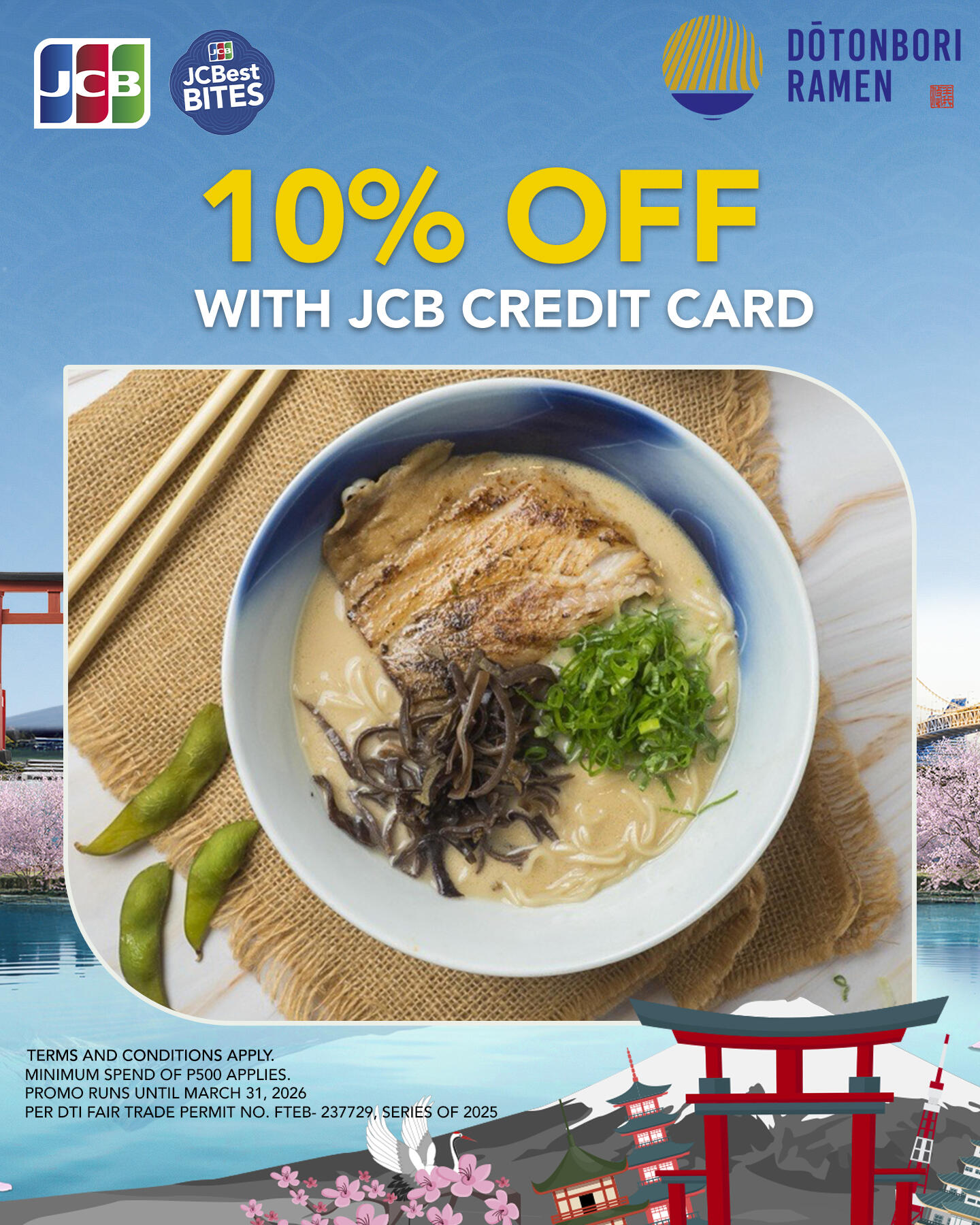 - JCB Credit Cardholders may enjoy 10% OFF with a minimum spend of P500 at Dotonbori Ramen from October 1, 2025 – March 31, 2026