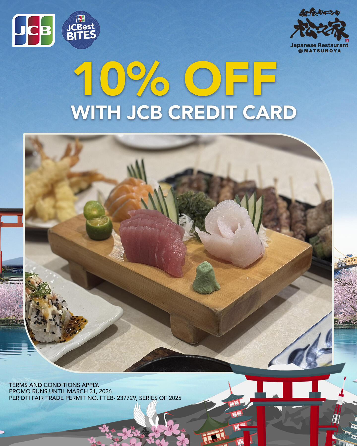 - JCB Credit Cardholders may enjoy 10% OFF at Matsunoya Japanese Restaurant from October 1, 2025 – March 31, 2026.