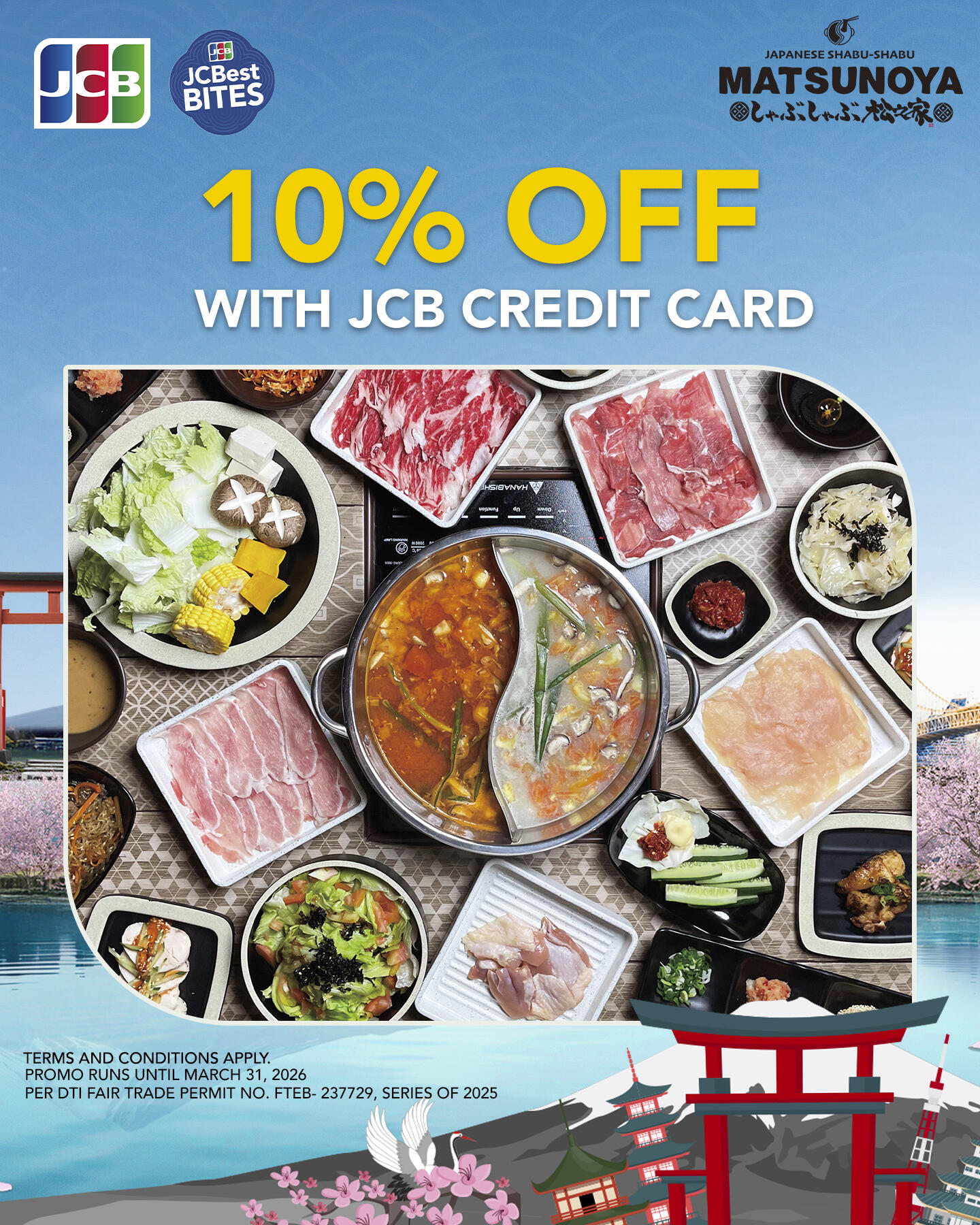 - JCB Credit Cardholders may enjoy 10% OFF at Matsunoya Shabu-Shabu from October 1, 2025 – March 31, 2026.