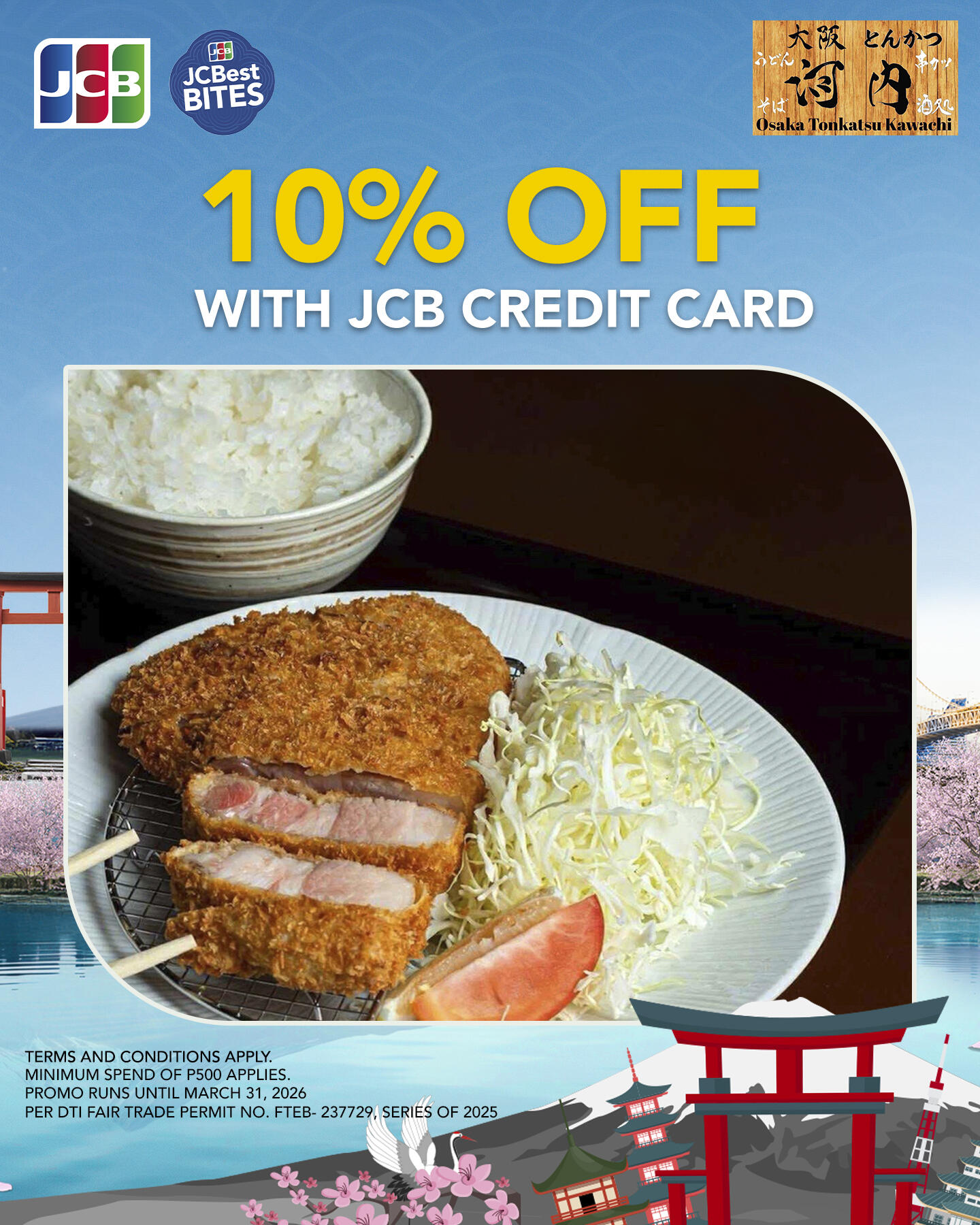 2.JCB Credit Cardholders may enjoy 10% OFF with a minimum spend of P500 at Osaka Tonkatsu Kawachi from October 1, 2025 – March 31, 2026