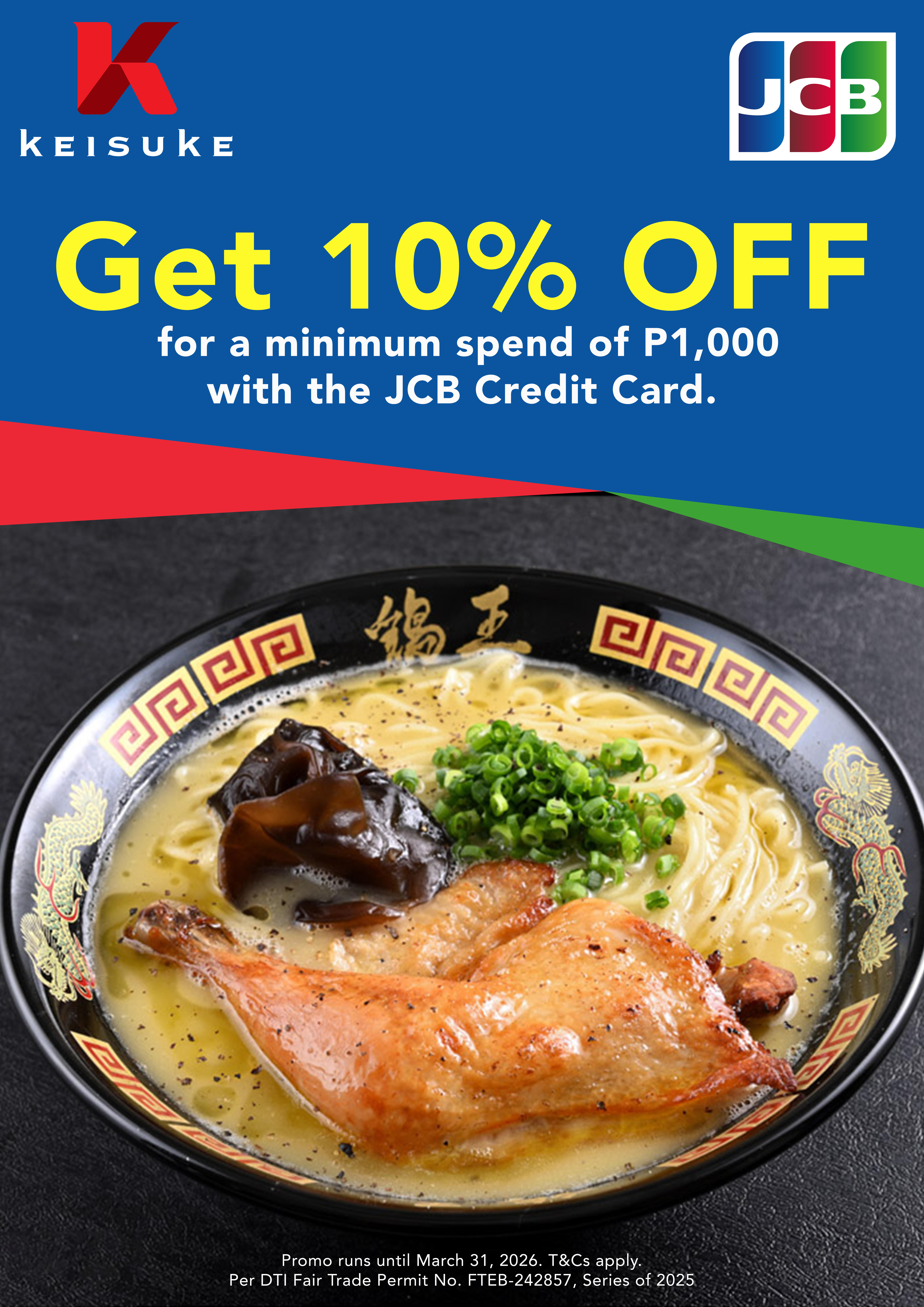 - JCB Credit Cardholders may enjoy 10% OFF with a minimum spend of P1,000 at Ramen Keisuke Tori King from December 1, 2025 – March 31, 2026