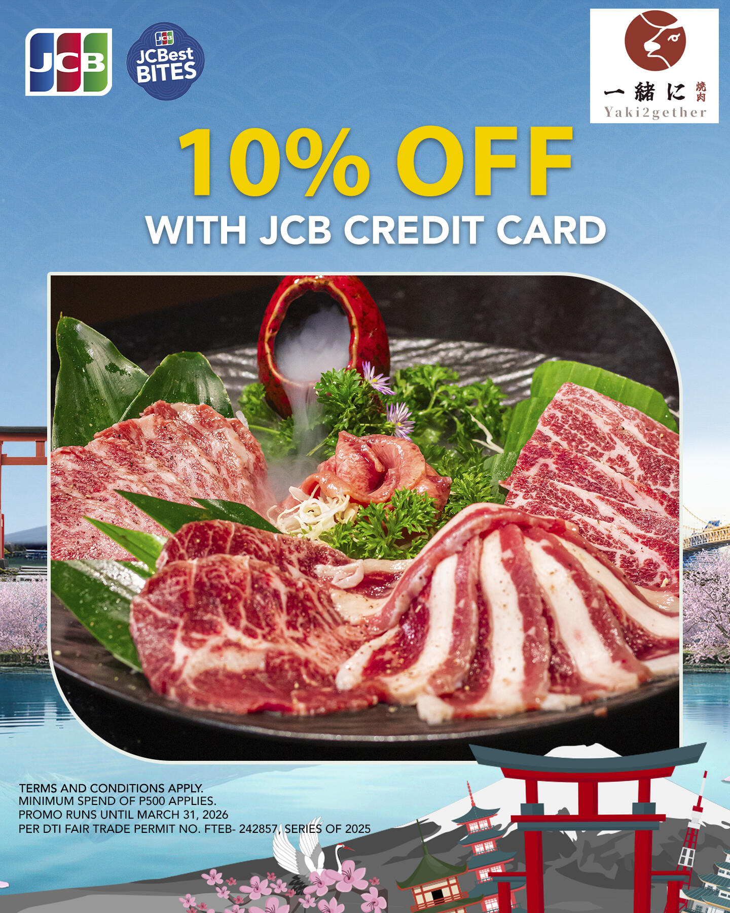 - JCB Credit Cardholders may enjoy 10% OFF with a minimum spend of P500 at Yaki2gether from December 1, 2025 – March 31, 2026
