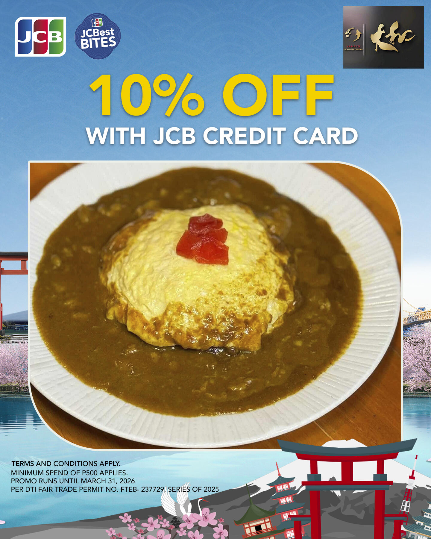 - JCB Credit Cardholders may enjoy 10% OFF with a minimum spend of P500 at Yamato Japanese Cuisine from October 1, 2025 – March 31, 2026