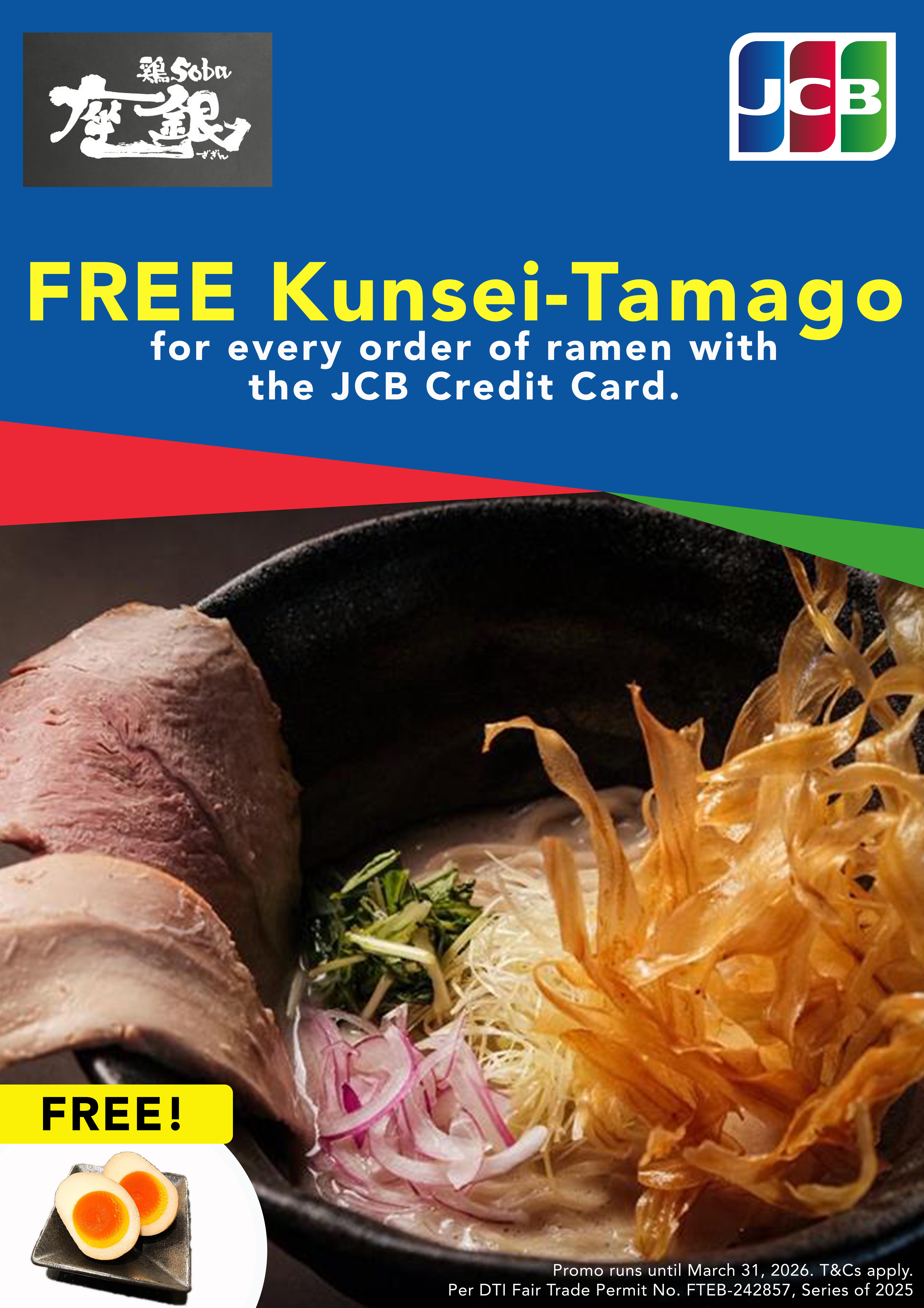 - JCB Credit Cardholders may enjoy a FREE Kunsei-Tamago for every order of ramen bowl at Zagin Soba from December 1, 2025 to March 31, 2026
