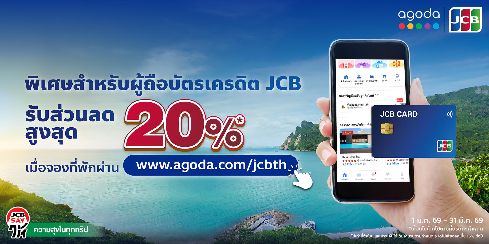 รับส่วนลดสูงสุด 20%* เมื่อจองที่พักและชำระเงินผ่านเว็บไซต์ www.agoda.com/jcbth เท่านั้น