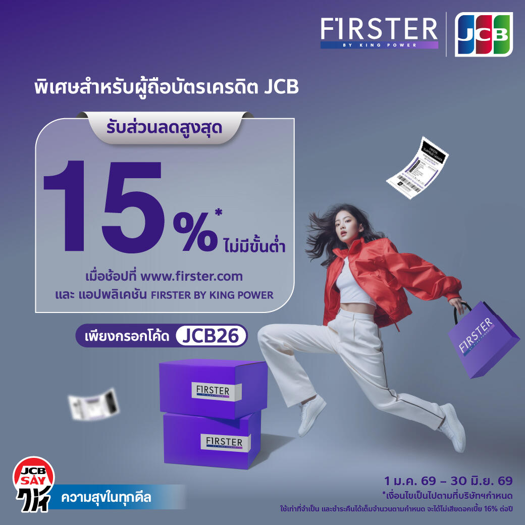 - รับส่วนลดเพิ่มสูงสุด 15% ไม่มีขั้นต่ำ สามารถใช้ได้ที่ www.firster.com และ แอปพลิเคชัน FIRSTER BY KING POWER เพียงกรอกโค้ด : JCB26 ตั้งแต่วันที่ 1 มกราคม 2569 – 30 มิถุนายน 2569