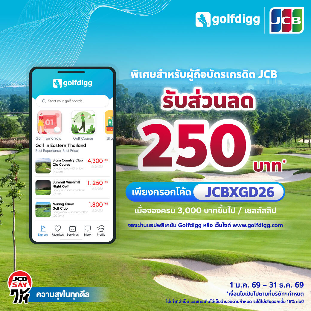 - จองผ่านแอปพลิเคชัน Golfdigg หรือ เว็บไซต์ www.golfdigg.com รับส่วนลด 250 บาท ต่อการจอง เมื่อจองครบ 3,000 บาทขึ้นไป / เซลล์สลิป ตั้งแต่วันที่ 1 มกราคม 2569 ถึง 31 ธันวาคม 2569