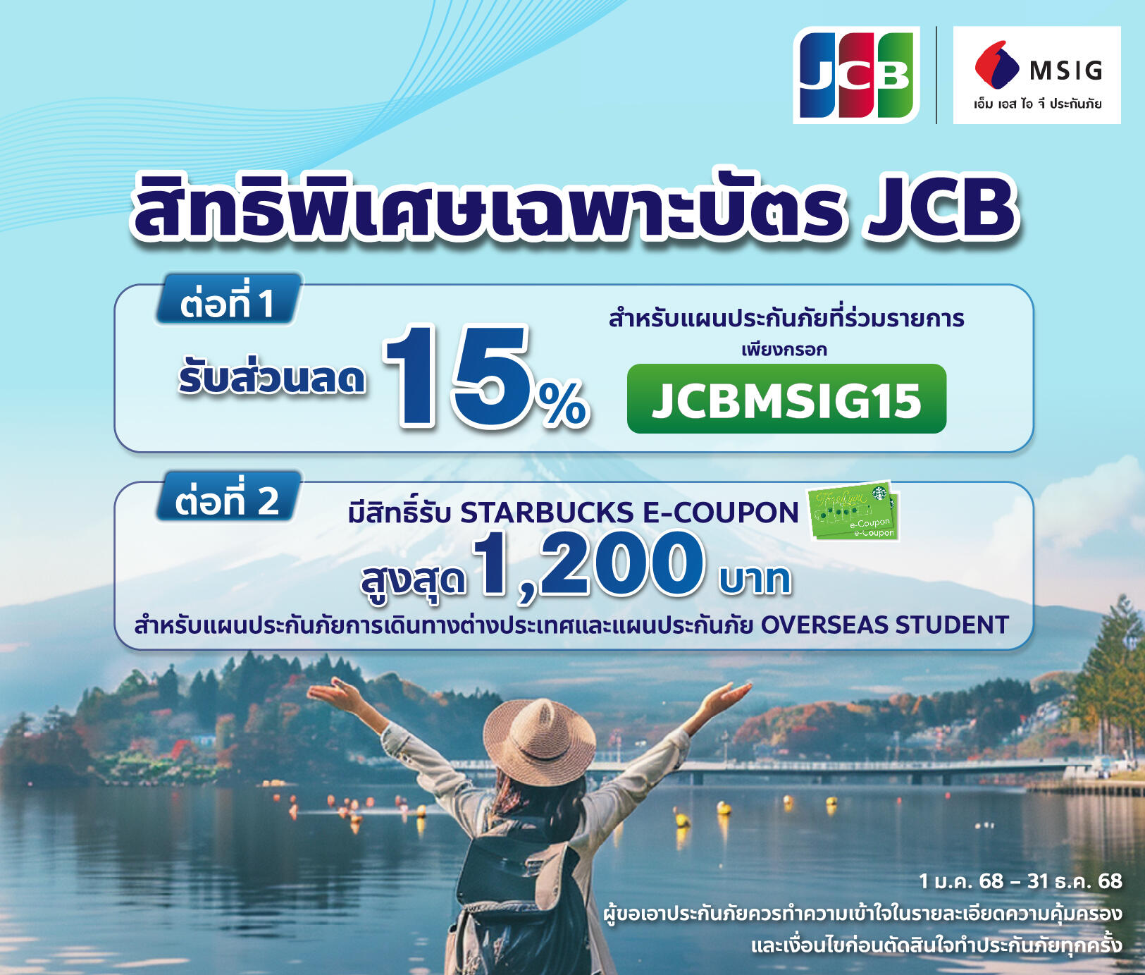2. รับส่วนลด 15% สำหรับแผนประกันภัยการเดินทางต่างประเทศ, แผนประกันภัยการเดินทางในประเทศ, แผนประกันภัยเพื่อการศึกษาต่อต่างประเทศ, แผนประกันภัยรถยนต์เซฟการ์ด ประเภท 2+ และ 3+, แผนประกันภัยโรคมะเร็ง, แผนประกันภัยโรคสุดฮิต และแผนประกันภัยบ้านแทนรัก เมื่อซื้อและชำระเงินผ่านทางเว็บไซต์ https://psmart.msig-thai.com/jcb/infopage และกรอกโค้ด "JCBMSIG15" เท่านั้น
