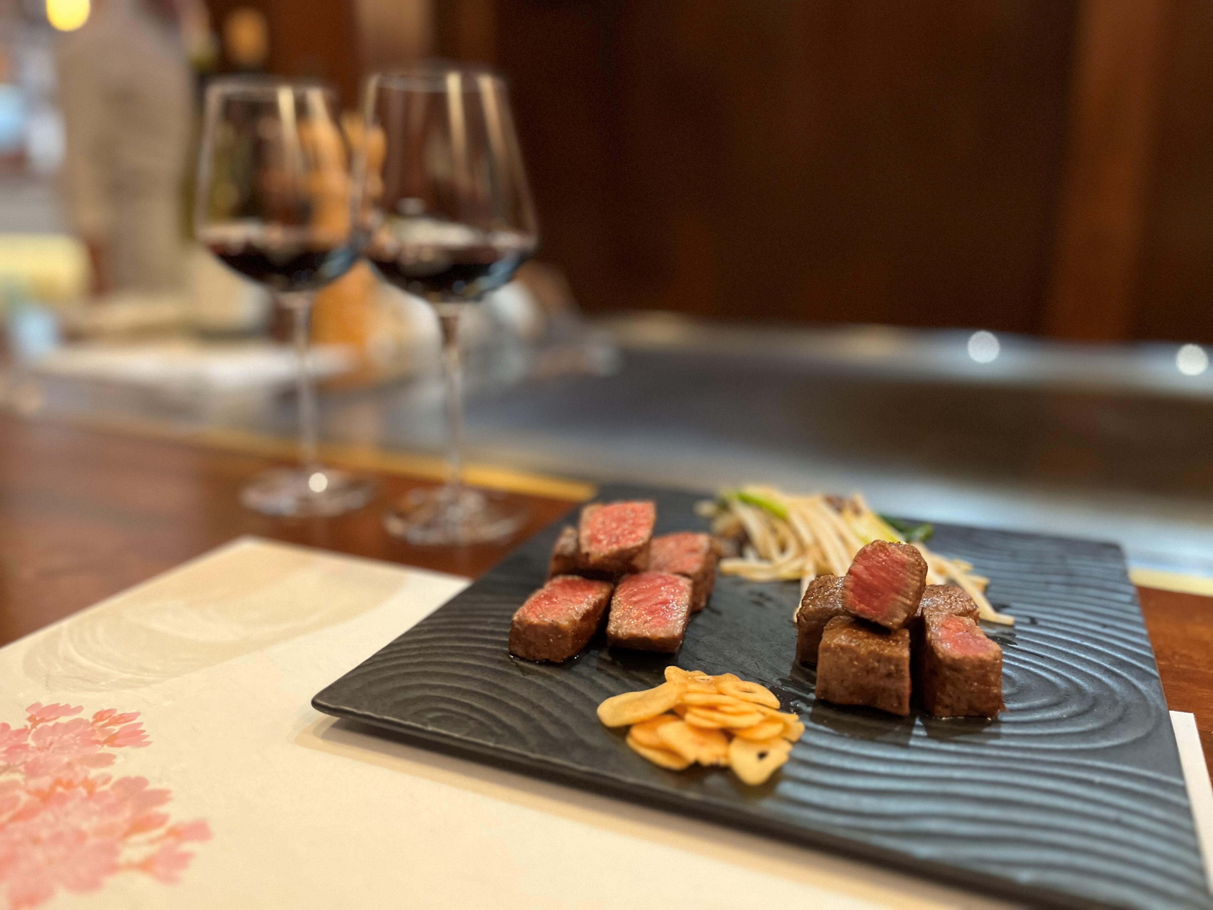 Món chính của bữa ăn chính là thịt bò Kuroge Wagyu hạng A5 được lựa chọn cẩn thận và chế biến dưới dạng bít tết thăn và phi lê để bạn so sánh. Với trọng lượng 50g mỗi loại, bạn sẽ bị mê hoặc bởi độ dày của miếng thịt cùng mặt cắt đẹp mắt!