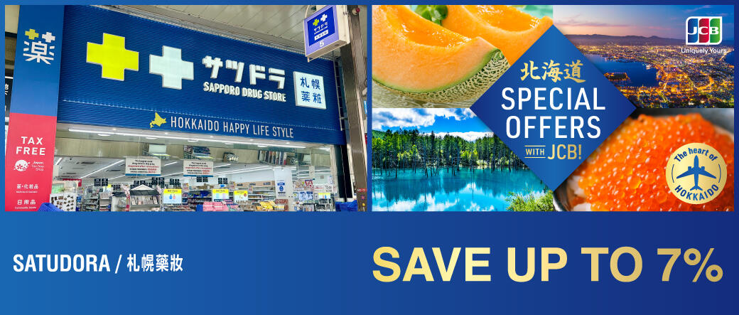 在北海道与冲绳地区受欢迎的药妆店--札幌药妆(Satudora),消费至高可享7%折扣!优惠率取决于您的消费总额。结账时只需出示本页优惠券并使用JCB卡(通过JCB通道)进行支付,即可享受优惠。详情请参见下文。