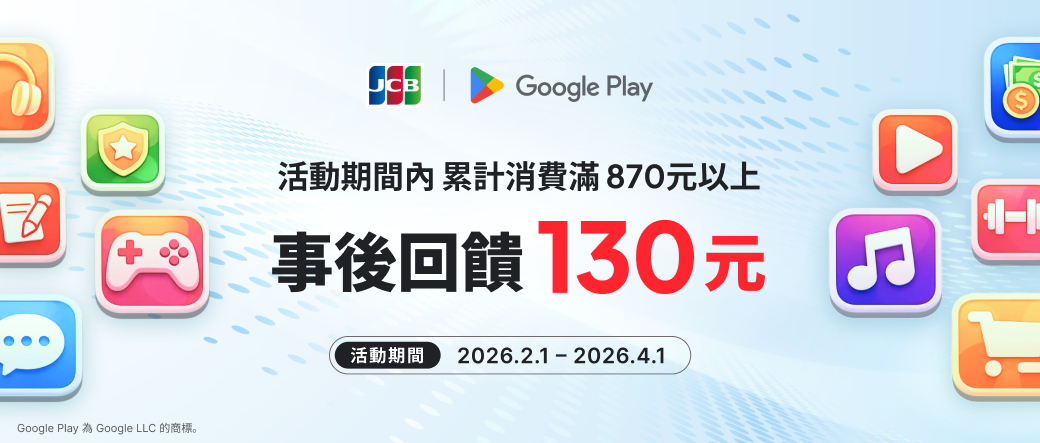 於活動期間刷台灣地區發行之JCB卡購買Google Play內提供的內容及服務,累計消費滿額870元以上,可享130元事後現金回饋。