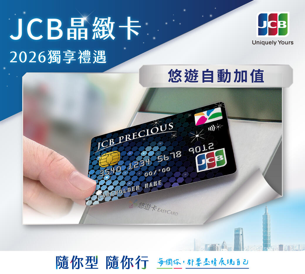 - 持卡人應持本活動指定之『JCB極緻悠遊聯名卡、JCB晶緻悠遊聯名卡、JCB晶緻悠遊Debit卡』(以下統稱卡片)參加活動,並提供以下資料進行登錄: