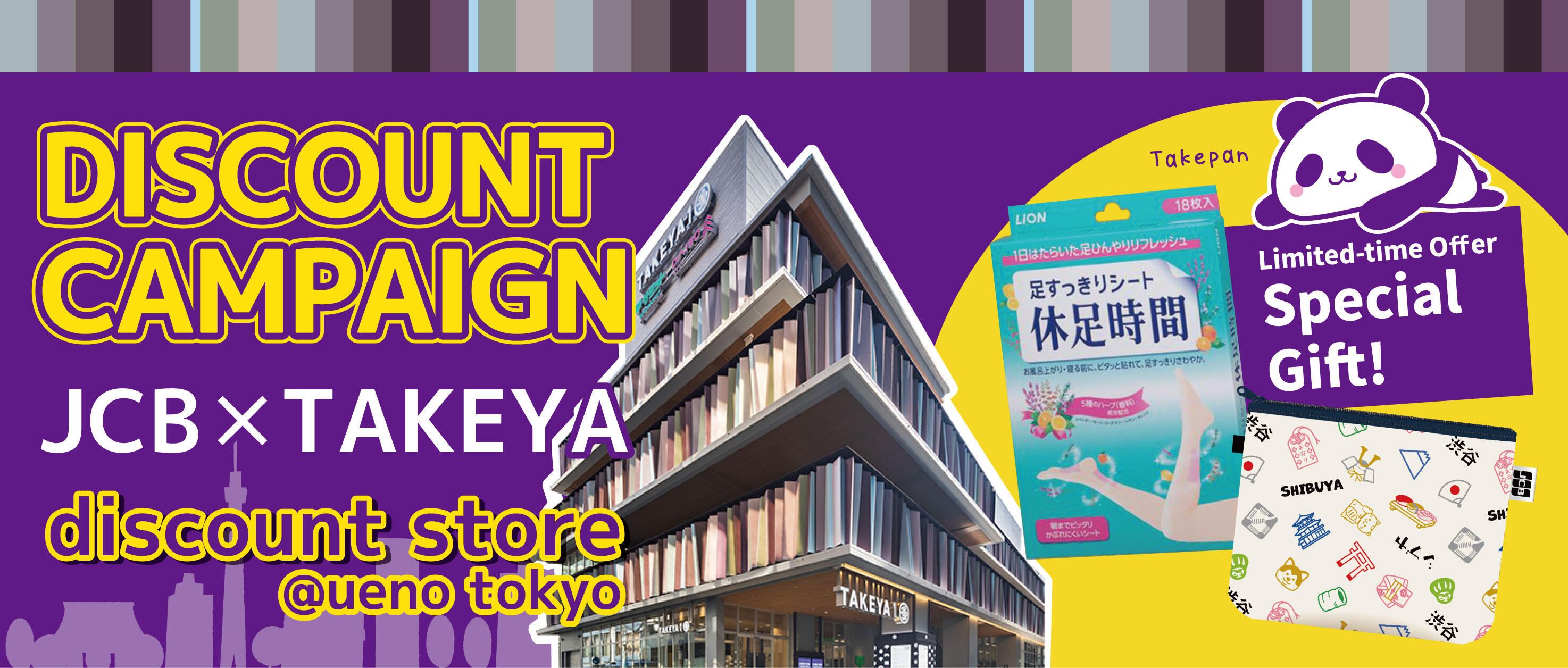 Shop with JCB card at Takeya to get 10% off when spending at least 5,000 yen! Maximum discount 10,000 yen.