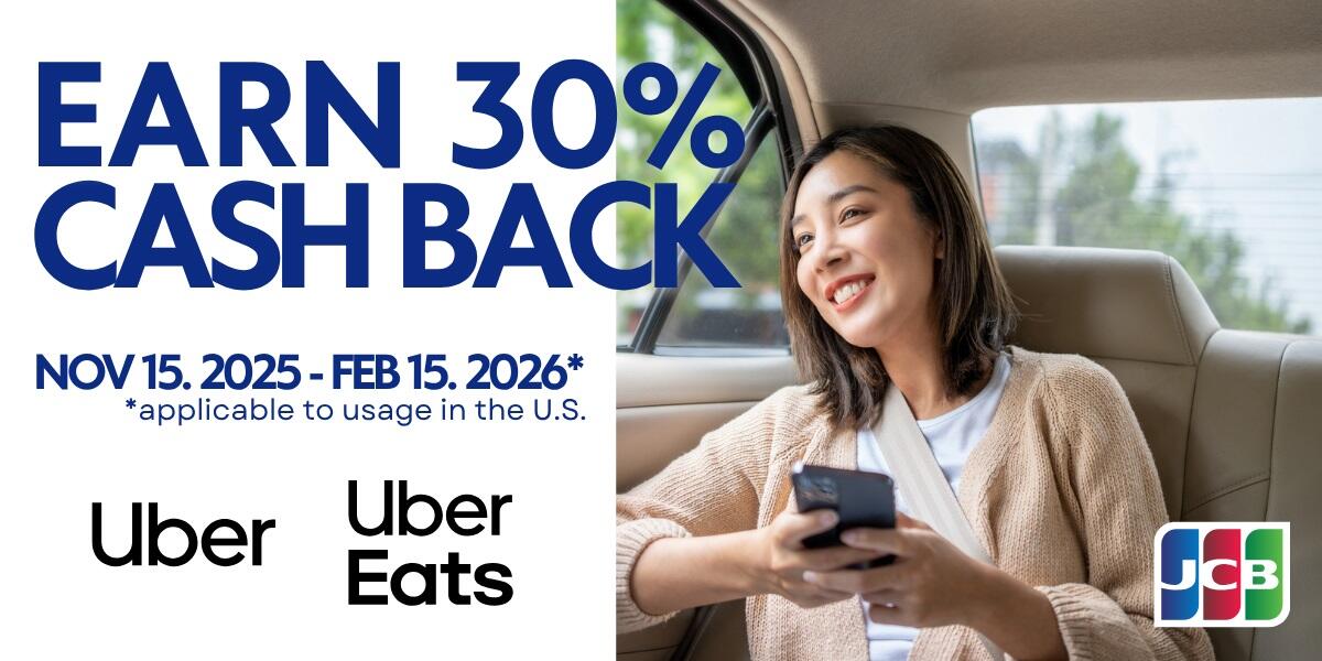 Dapatkan cashback 30% (hingga USD 30) saat Anda menggunakan Uber atau Uber Eats dengan kartu JCB Anda di Amerika Serikat – Terbatas untuk 1.000 peserta pertama per periode promo!