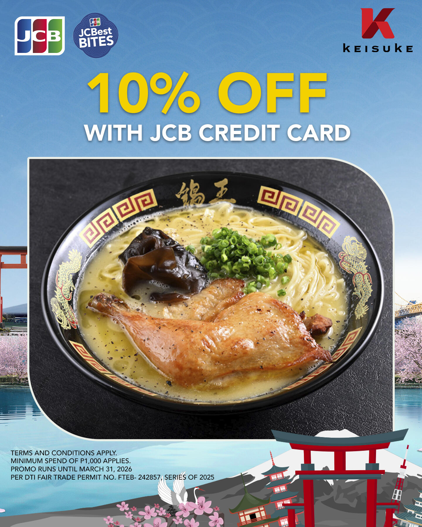 - JCB Credit Cardholders may enjoy 10% OFF with a minimum spend of P1,000 at Ramen Keisuke Tori King from December 1, 2025 – March 31, 2026