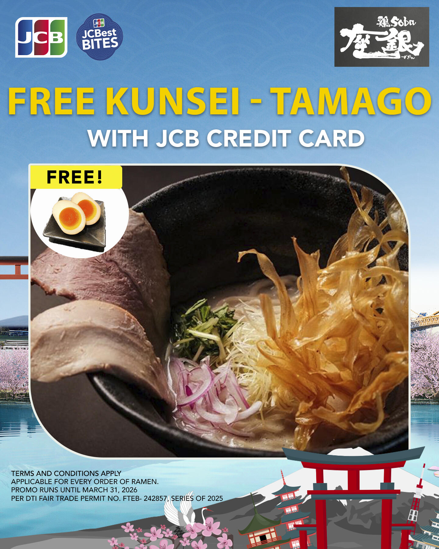 - JCB Credit Cardholders may enjoy a FREE Kunsei-Tamago for every order of ramen bowl at Zagin Soba from December 1, 2025 to March 31, 2026