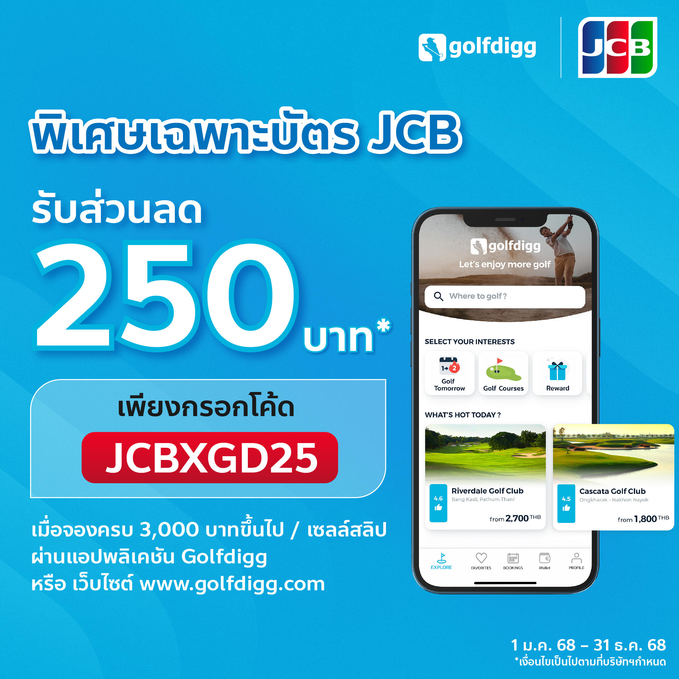 2. จองผ่านแอปพลิเคชัน Golfdigg หรือ เว็บไซต์ www.golfdigg.com รับส่วนลด 250 บาท ต่อการจอง เมื่อจองครบ 3,000 บาทขึ้นไป / เซลล์สลิป ตั้งแต่วันที่ 1 มกราคม 2568 ถึง 31 ธันวาคม 2568