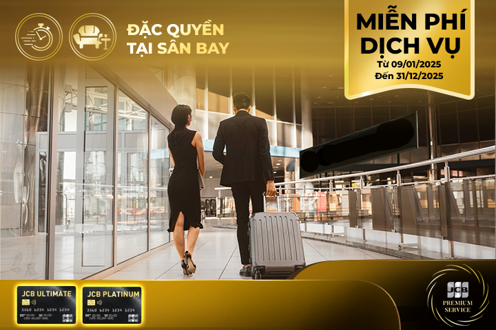 Tặng ngay 01 lượt/tháng sử dụng miễn phí phòng chờ sân bay Việt Nam (ga quốc tế/ nội địa) hoặc dịch vụ fast-track (ga quốc tế) cho chủ thẻ JCB Ultimate, JCB Platinum có tổng chi tiêu ở nước ngoài trong tháng trước đạt từ 15 triệu đồng trở lên (áp dụng cho tất cả chuyến bay).