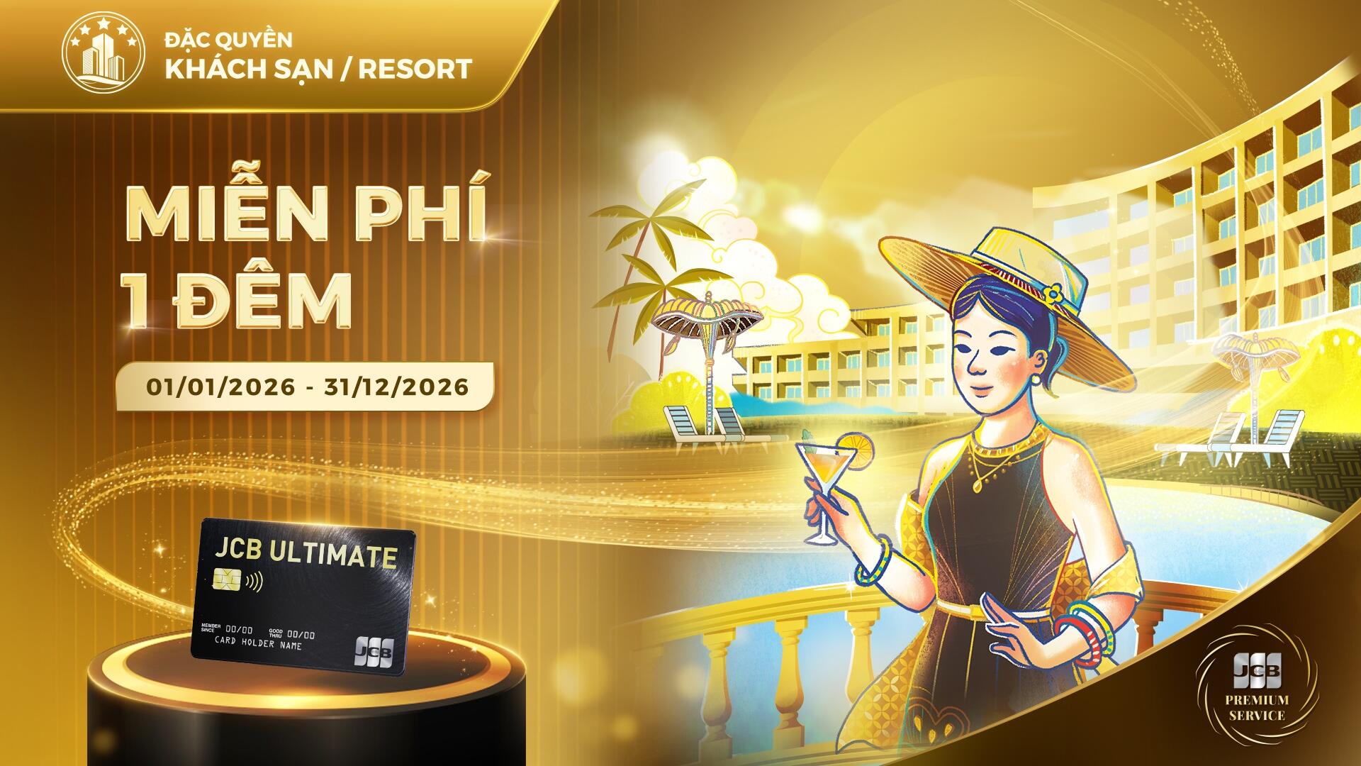 • Miễn phí 01 đêm khi đặt phòng ít nhất 2 đêm liền kề tại 40 khách sạn và khu nghỉ dưỡng cao cấp tại Việt Nam dành cho Chủ thẻ JCB Ultimate.