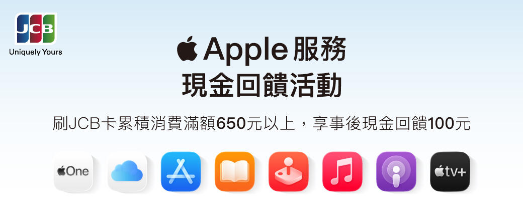 於活動期間刷JCB卡購買指定Apple Services,累計消費滿額650元以上,可享 100元事後現金回饋。