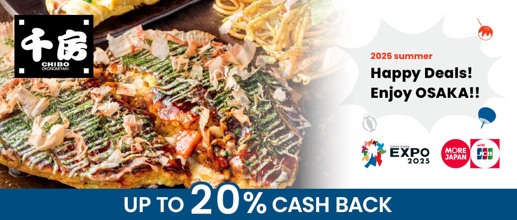 優惠一:於大阪市內「Chibo(千房)」指定門市刷JCB卡消費滿8,000日圓,可享最高20%事後現金回饋。